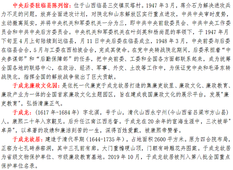 晋绥纪念馆、四.八烈士纪念馆、西北局旧址毛泽东东渡黄河纪念碑、中央后委驻临县陈列馆、于成龙廉政文化园、刘胡兰纪念馆三日